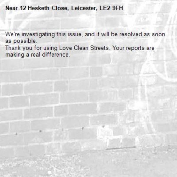 -12 Hesketh Close, Leicester, LE2 9FH 18/11/2025 09:18 We’re investigating this issue, and it will be resolved as soon as possible. Thank you for using Love Clean Streets. Your reports are making a real difference.