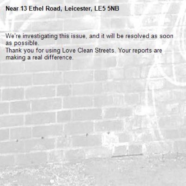 -13 Ethel Road, Leicester, LE5 5NB 18/11/2025 13:07 We’re investigating this issue, and it will be resolved as soon as possible. Thank you for using Love Clean Streets. Your reports are making a real difference.