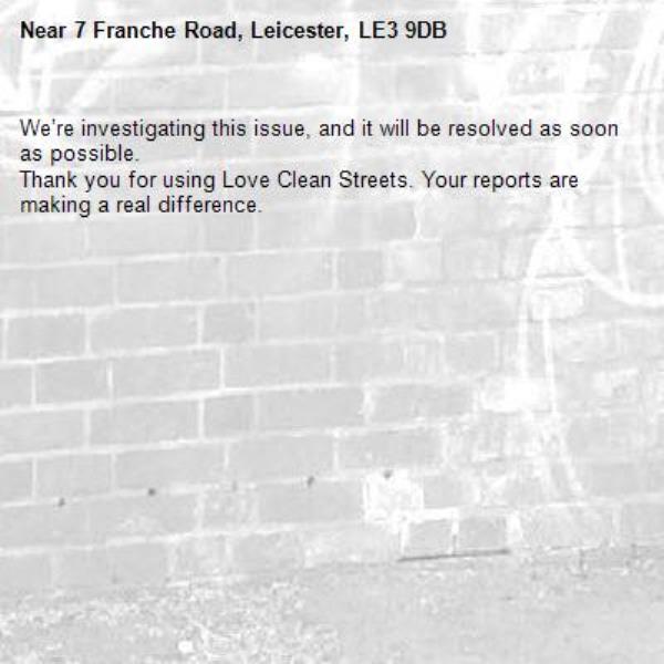 -7 Franche Road, Leicester, LE3 9DB 18/11/2025 12:59 We’re investigating this issue, and it will be resolved as soon as possible. Thank you for using Love Clean Streets. Your reports are making a real difference.