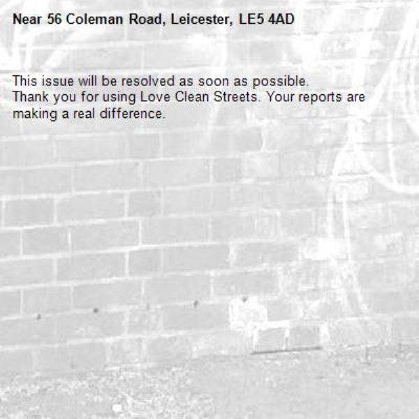 -56 Coleman Road, Leicester, LE5 4AD 18/11/2025 09:04 This issue will be resolved as soon as possible. Thank you for using Love Clean Streets. Your reports are making a real difference.