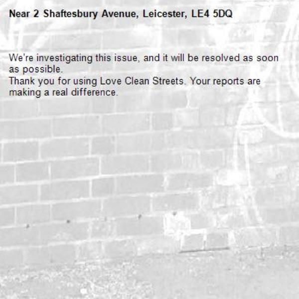 -2 Shaftesbury Avenue, Leicester, LE4 5DQ 18/11/2025 08:14 We’re investigating this issue, and it will be resolved as soon as possible. Thank you for using Love Clean Streets. Your reports are making a real difference.