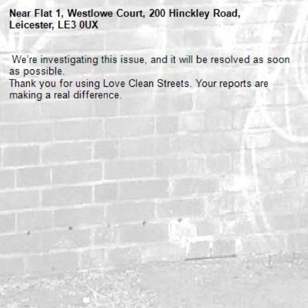 -Flat 1, Westlowe Court, 200 Hinckley Road, Leicester, LE3 0UX 18/11/2025 13:04 We’re investigating this issue, and it will be resolved as soon as possible. Thank you for using Love Clean Streets. Your reports are making a real difference.